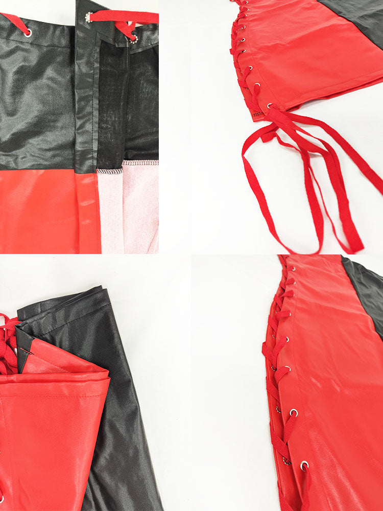 Features: Off-shoulder, leather, color block, patchwork, tie-up, bodycon mini dress.