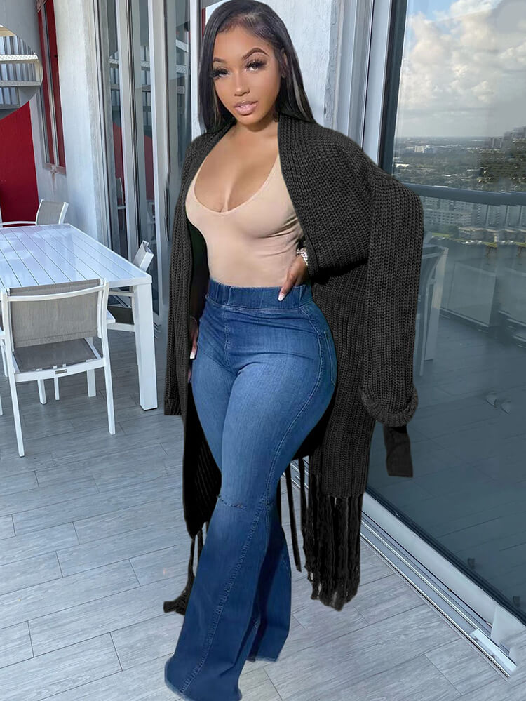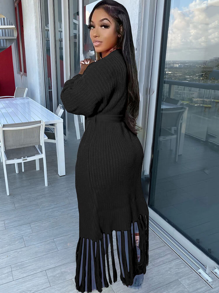 Característica: manga larga, color sólido, cuello en V, cárdigan, atado, bodycon, borla, cinturón.