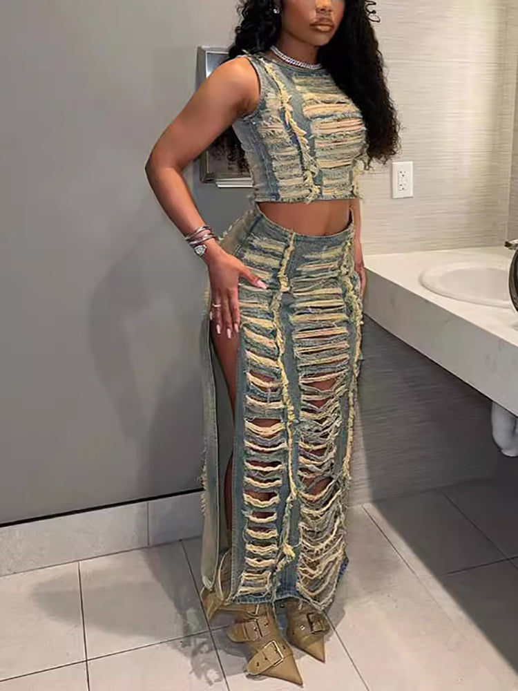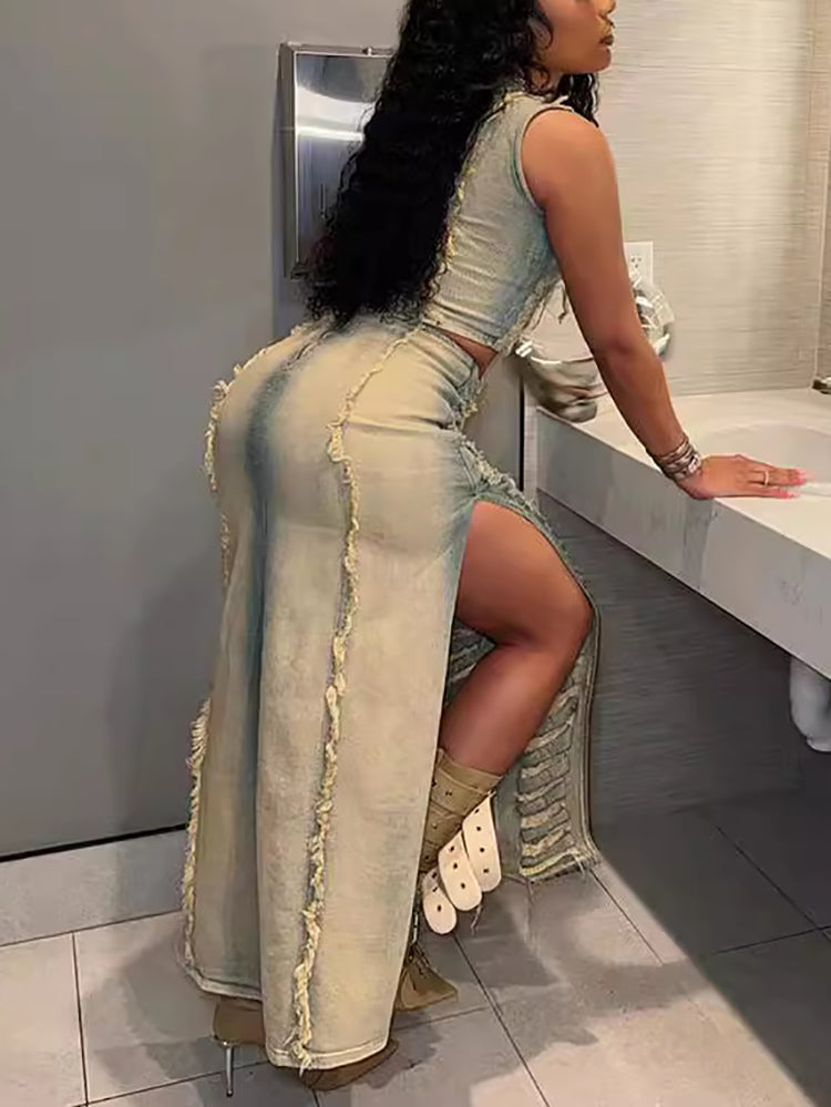 Top sin mangas de mezclilla desgastada de dos piezas y falda dividida