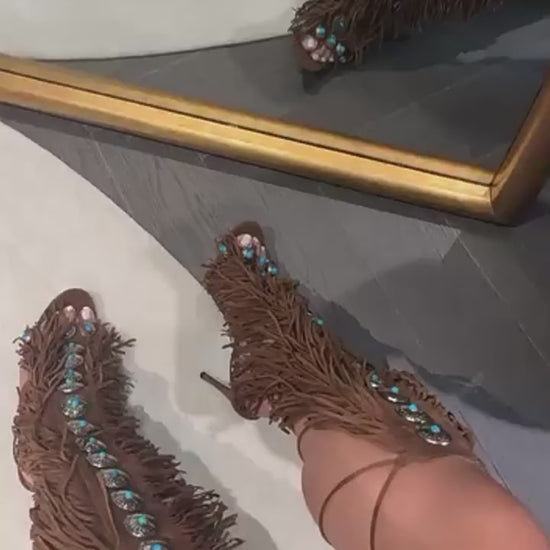 Boho Gemstone Lace-Up Fringe Heeled Sandals
