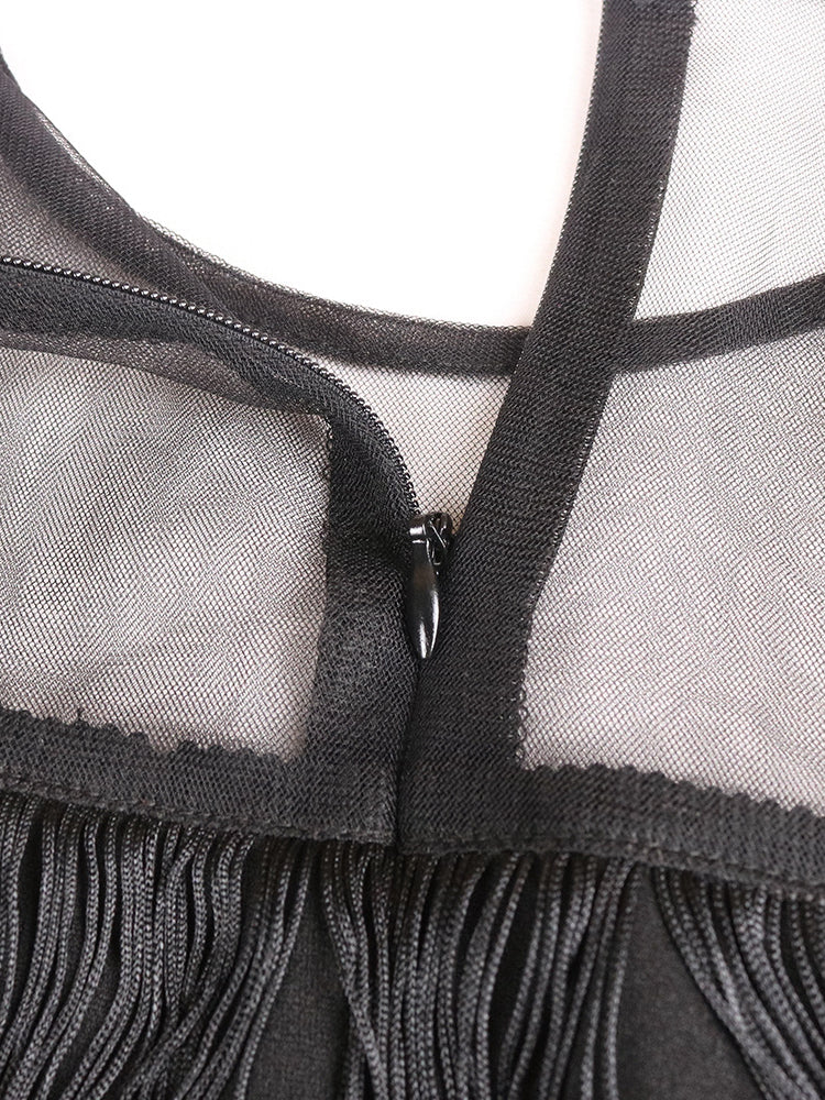 Plus Size Mesh Side Slit Tassel Fringe Dress
