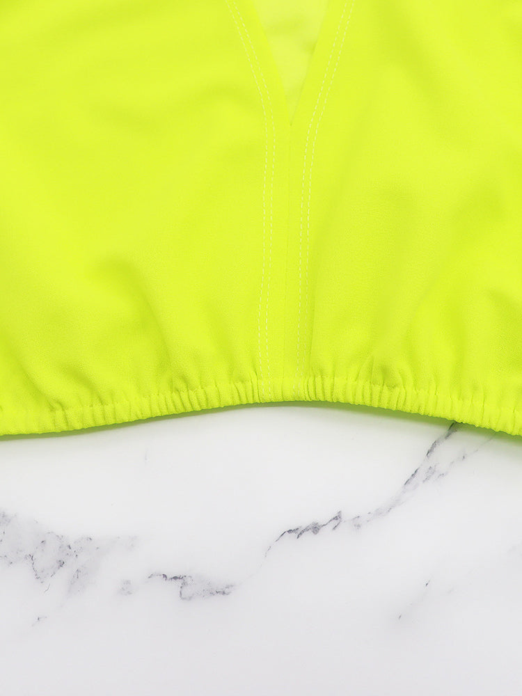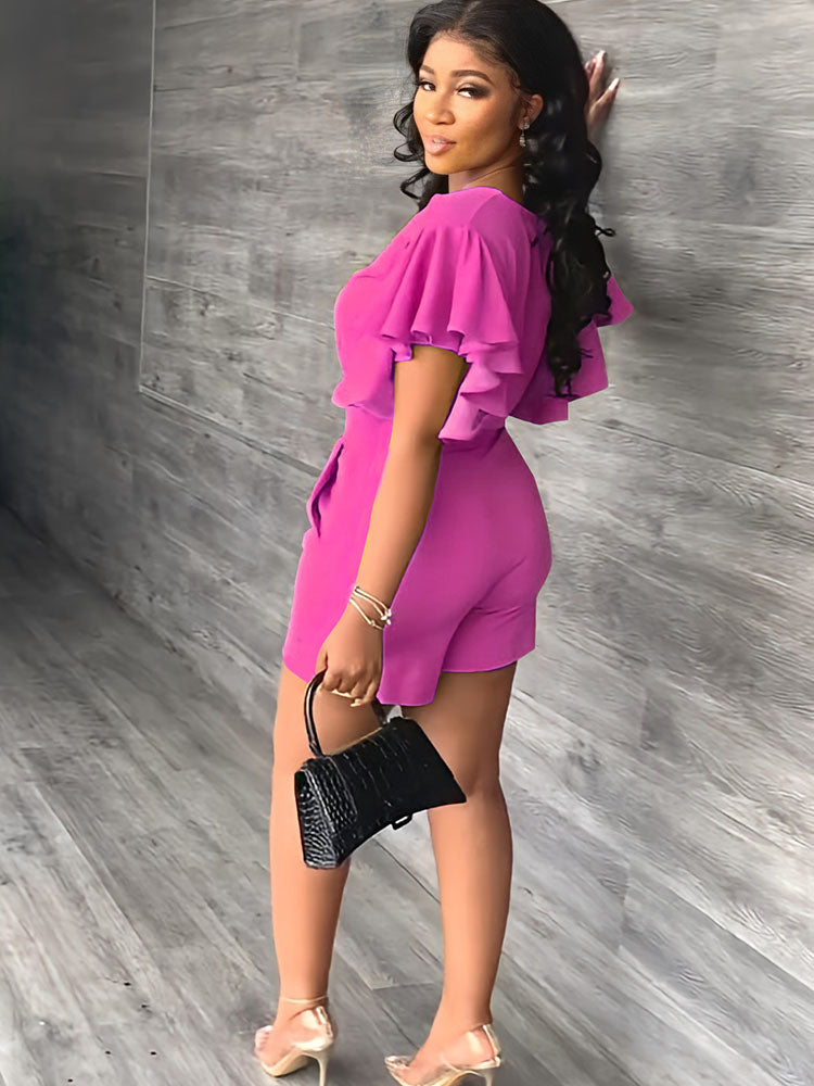 Característica: trajes de dos piezas, cuello en V profundo, mangas con volantes, top corto, color sólido, cintura alta, pantalones cortos con bolsillos.