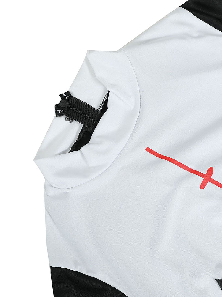 Características: manga corta, cuello alto, vestido midi. Los bordes irregulares, una cruz invertida y mangas y calzas con cicatrices añaden un toque aterrador al conjunto.