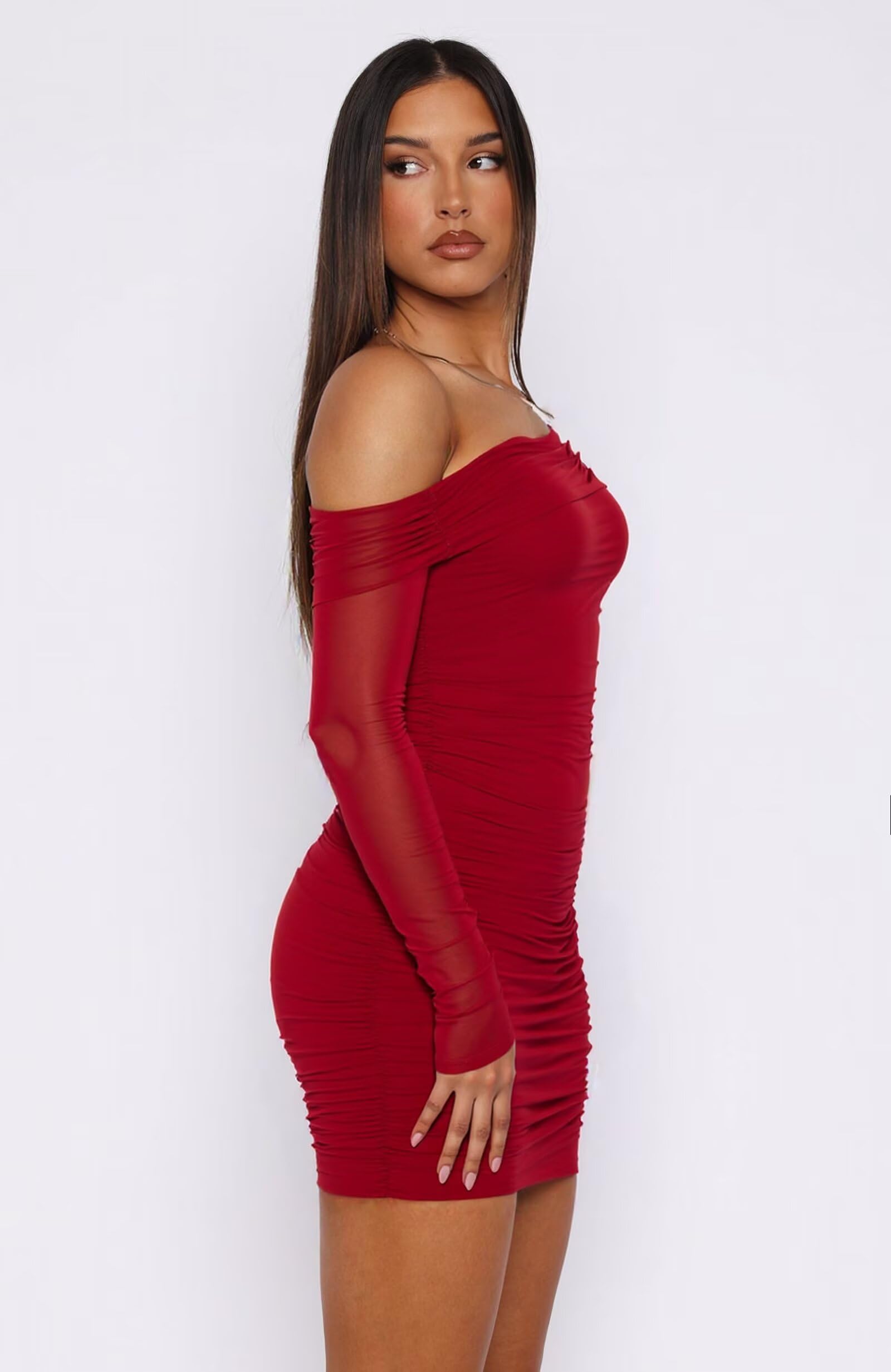Sheer Mesh Ruched Night out Dress Burgundy XX-Large 2