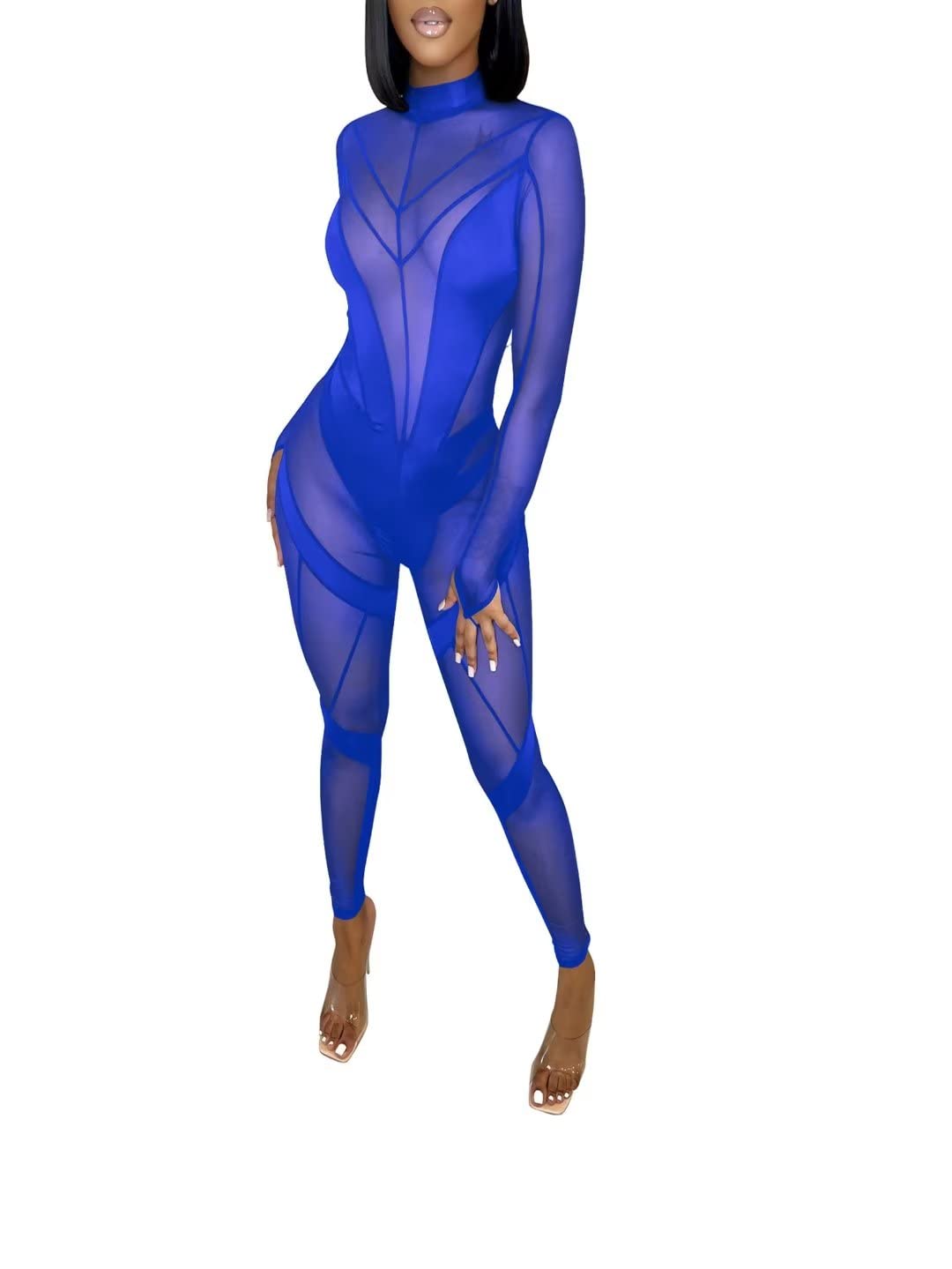 | Sheer Mesh Splicing Jumpsuit | Blue | X-Large | 2 |