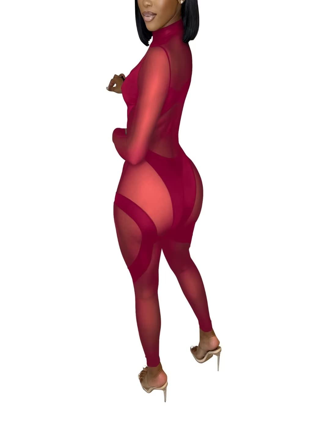 | Sheer Mesh Splicing Jumpsuit | Wine Red | X-Large | 3 |