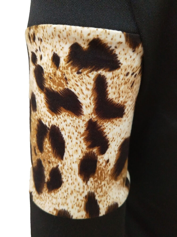 Características: cuello redondo, manga larga, manga acanalada, estampado de leopardo, patchwork, cintura alta, con bolsillos, ajuste delgado, traje de dos piezas.