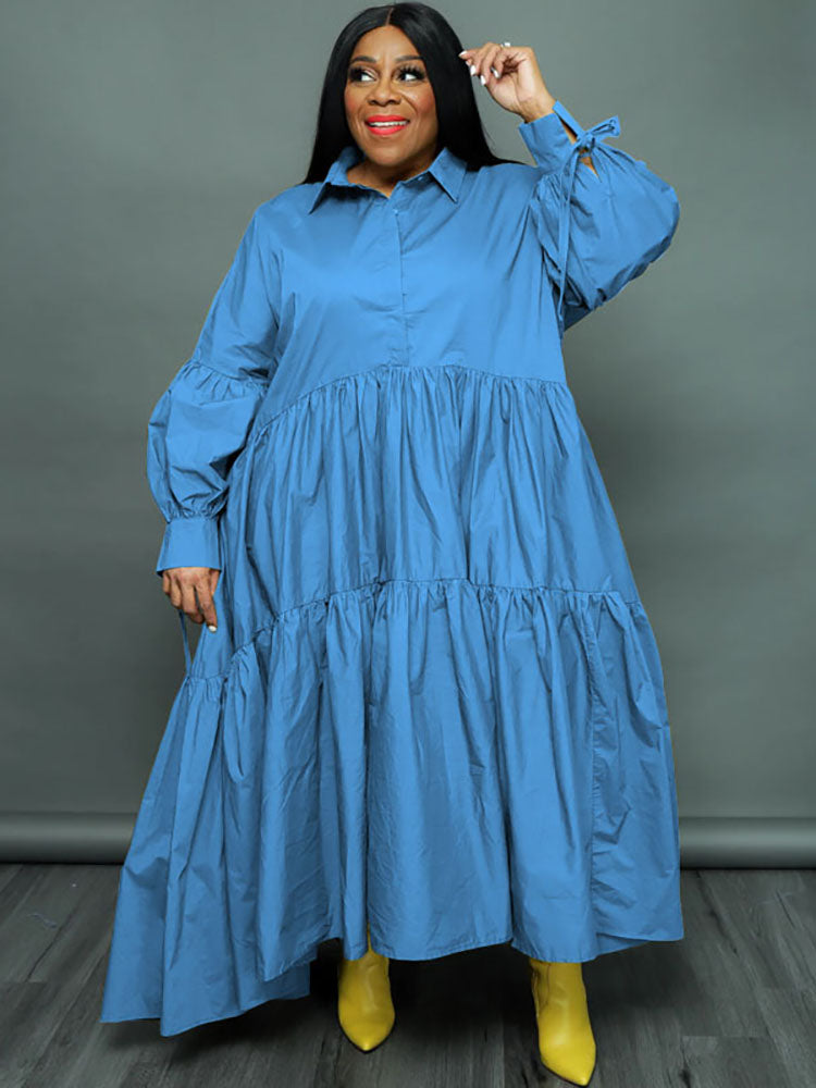 Características: talla grande, manga larga, botón, volantes, color sólido, suelto, maxi vestido.