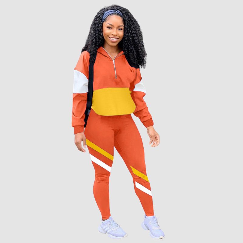 Características: conjunto, pantalones, cuello en V, sudaderas con capucha, cremallera, manga larga, pantalones largos, bodycon, contraste de color, diseño de patchwork, cintura alta.