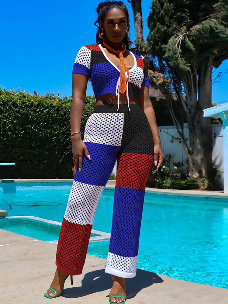 Característica: manga corta, bloque de color, top corto, patchwork, cordones, hueco, cintura alta, pantalones, trajes de dos piezas.