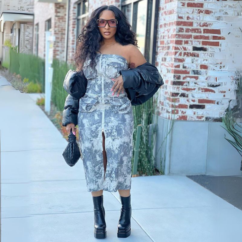 Características: vestido, sin tirantes, cremallera, diseño de graffiti, parche de bolsillo, sin mangas, contraste de color, ajustado, vestido midi.