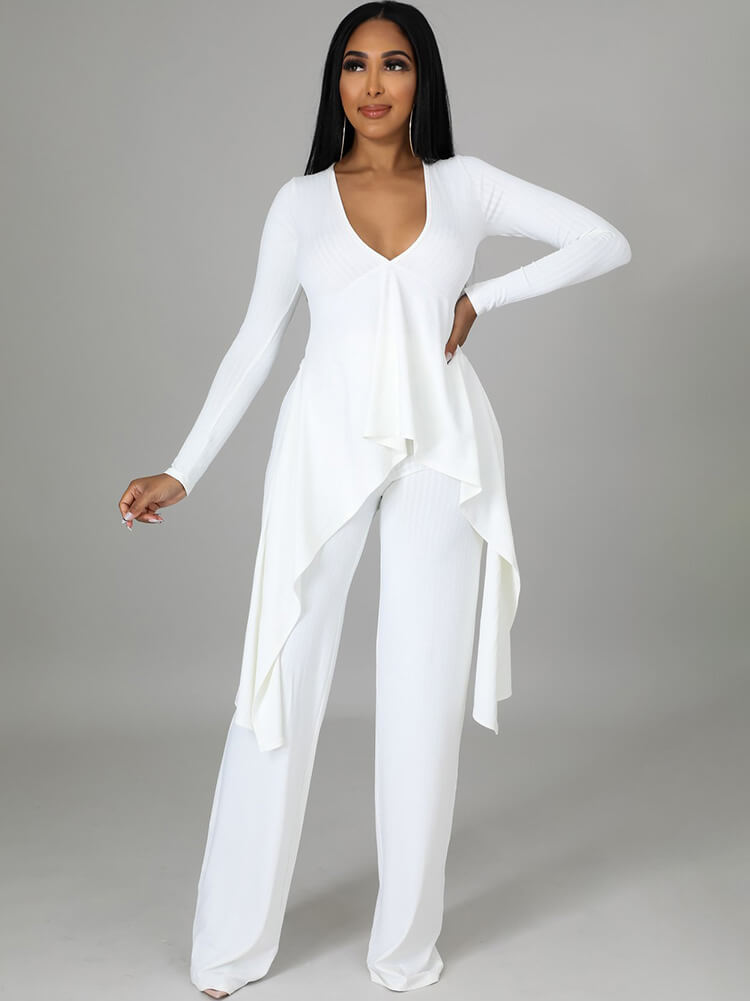 Top con cuello en V y pantalones largos con cordones irregulares de dos piezas
