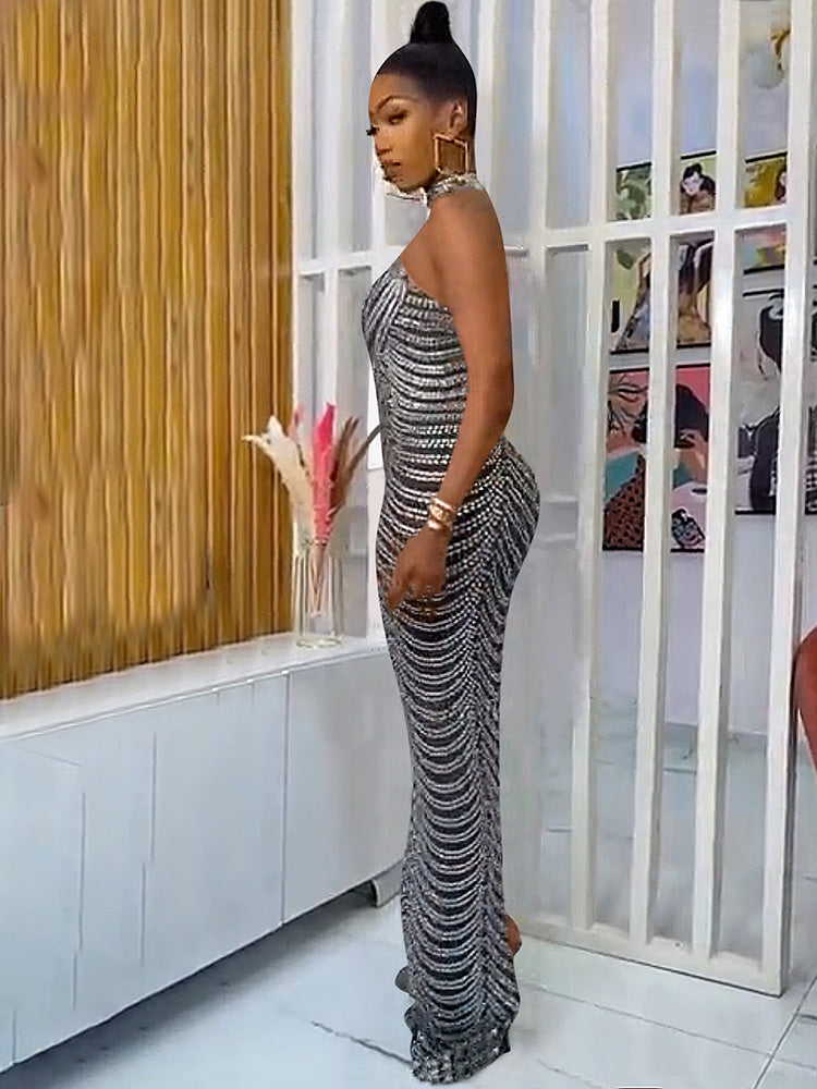 Características: maxivestidos, sin mangas, cuello alto, corte entallado, taladro caliente, diamantes de imitación, purpurina, espalda descubierta, malla, transparente.