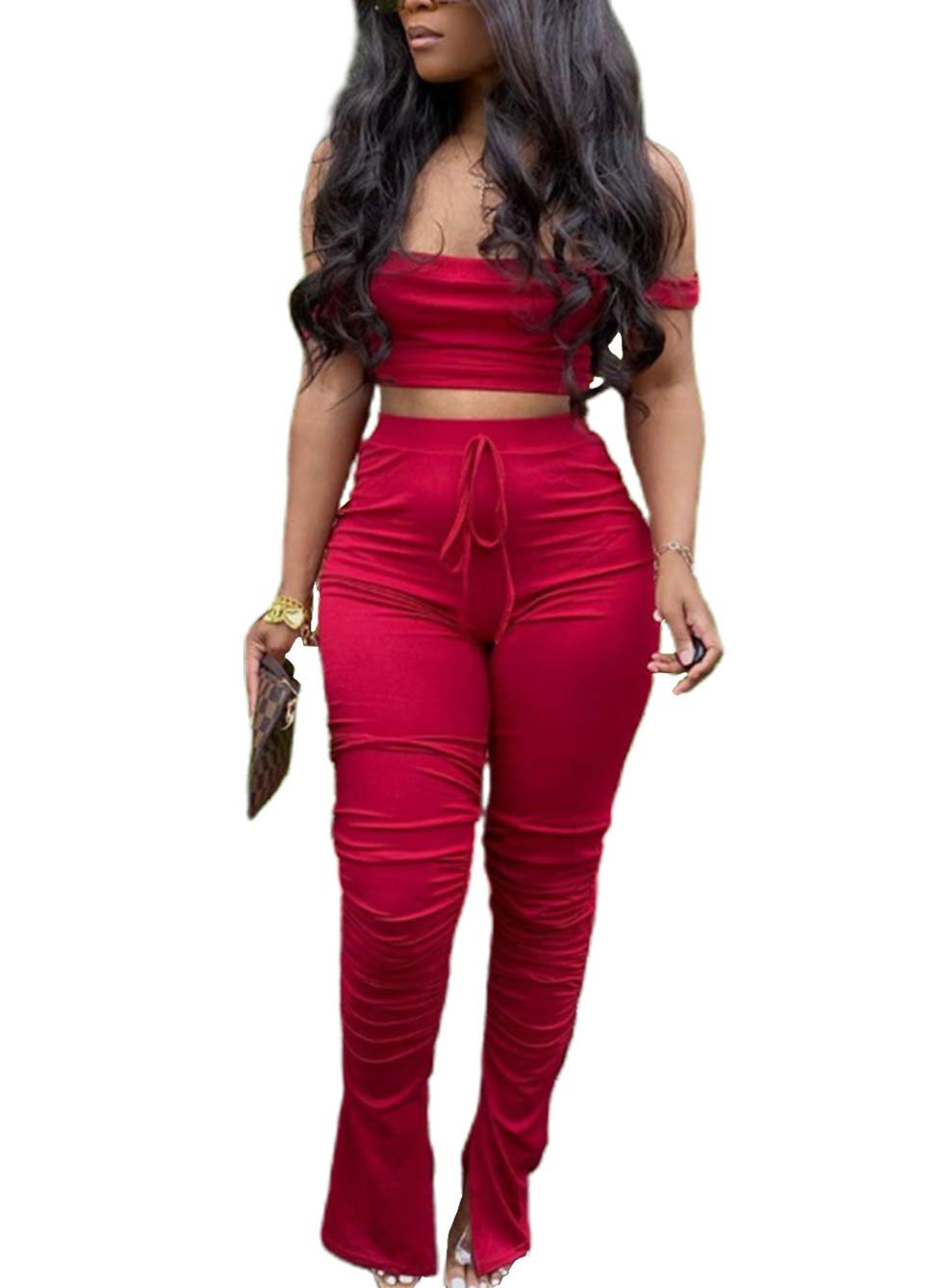 Este conjunto de dos piezas incluye un top corto de manga corta con hombros descubiertos y pantalones largos fruncidos con cordón. Confeccionado con tejido de poliéster elástico y de alta calidad, este conjunto ajustado es cómodo y agradable para la piel, adecuado para diversas ocasiones, como ropa casual, fitness, trabajo, fiestas y más. Perfecto para quienes buscan una opción sexy y elegante para una noche de fiesta o un evento especial.