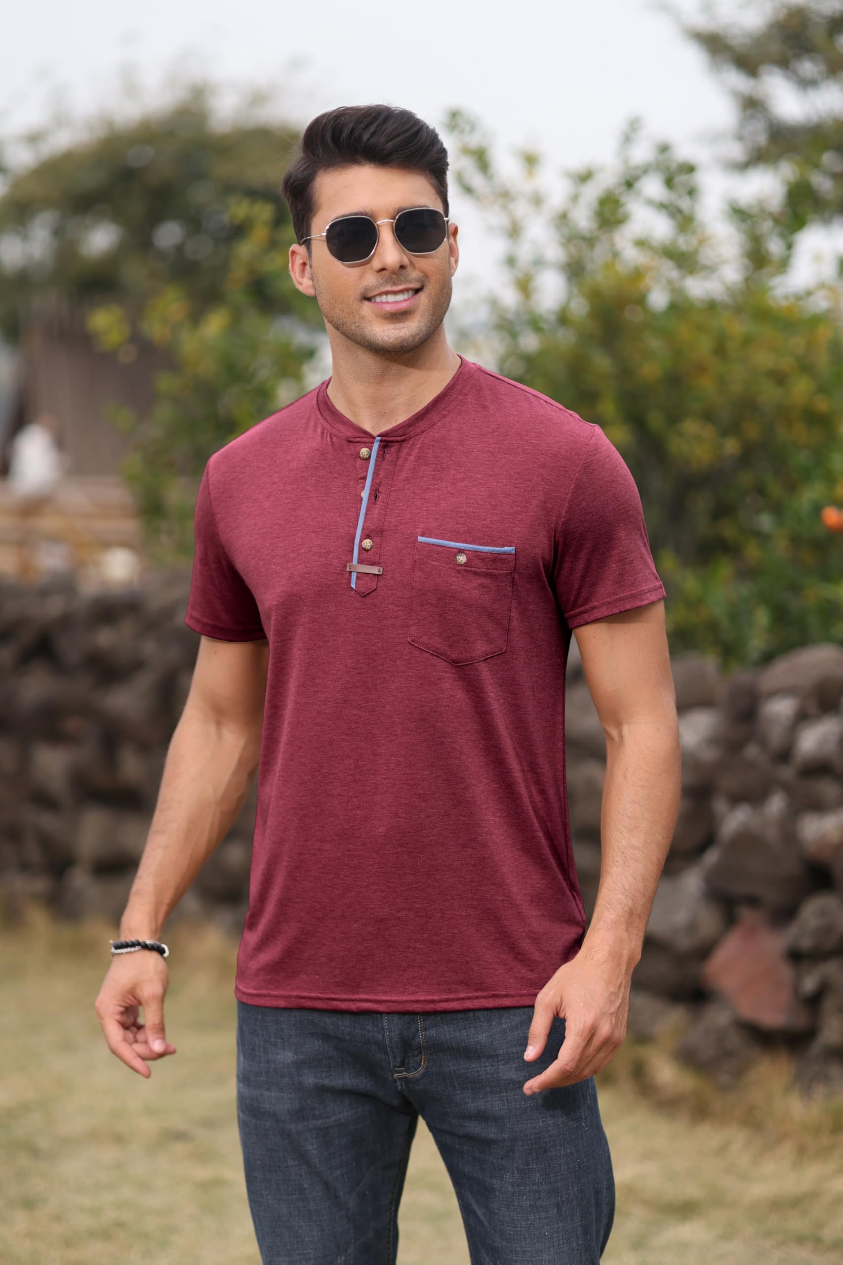Mens Henley Shirts Red Large 8