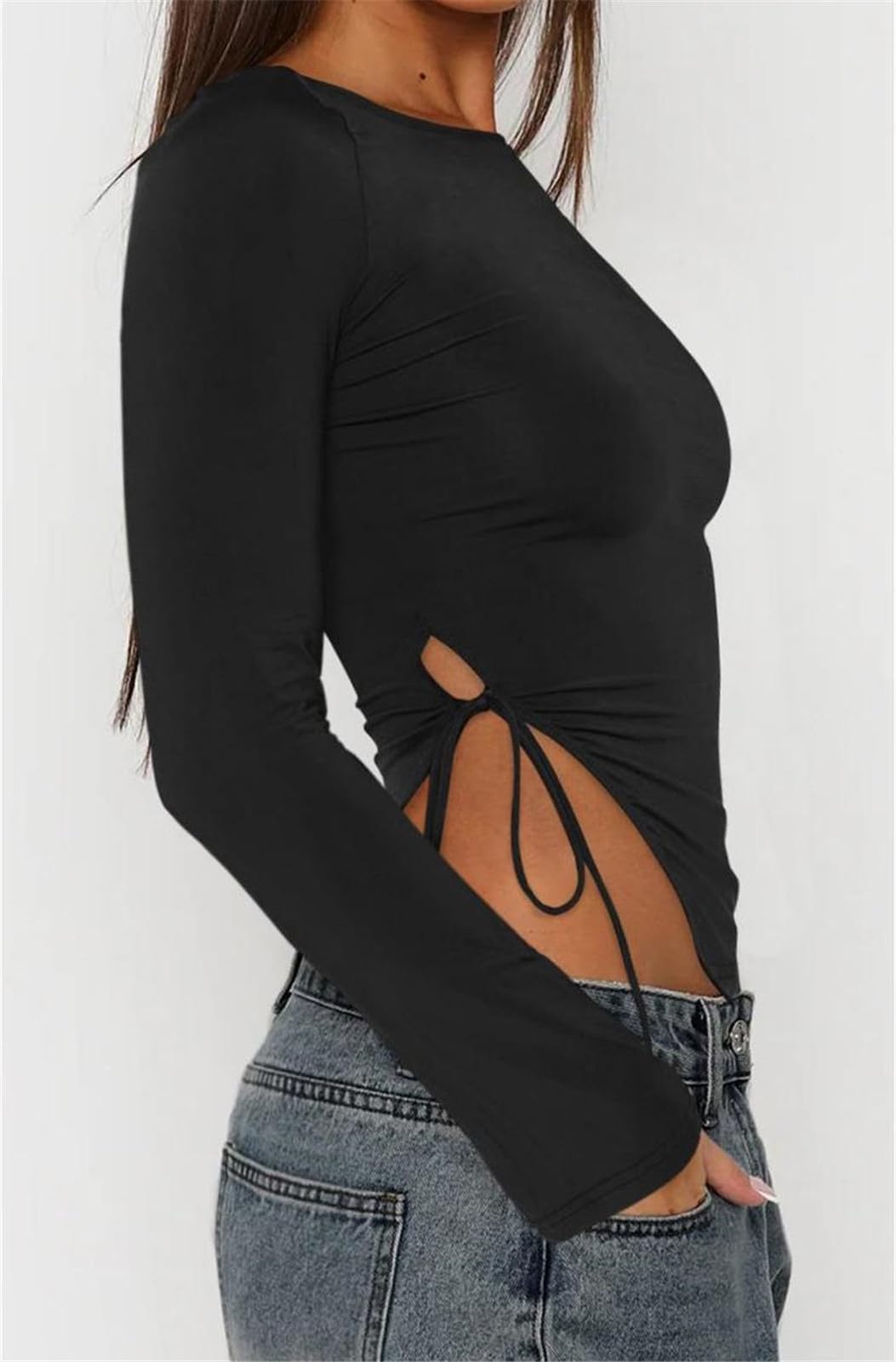Design: Side slit, drawstring, long sleeve, asymmetrical, tops, solid color, bodycon. The drawstring can be adjusted to create different styles.